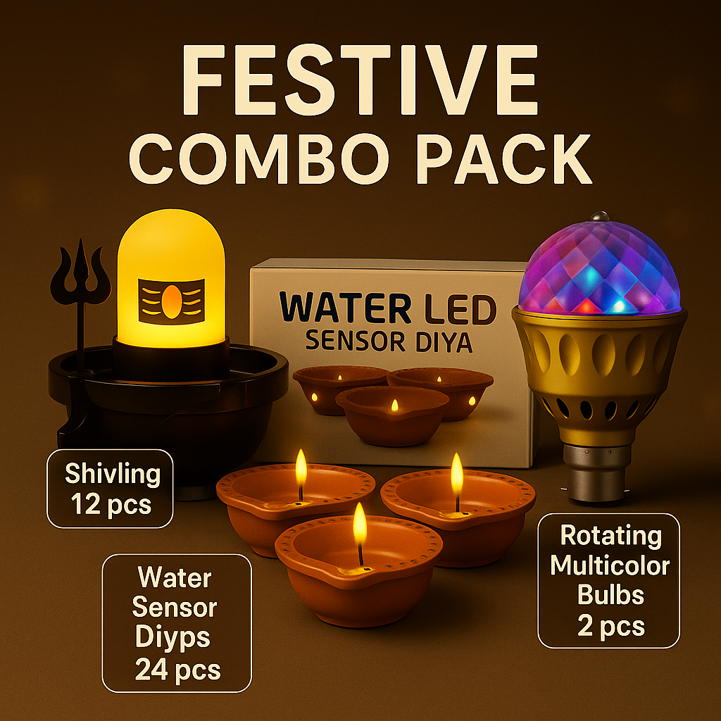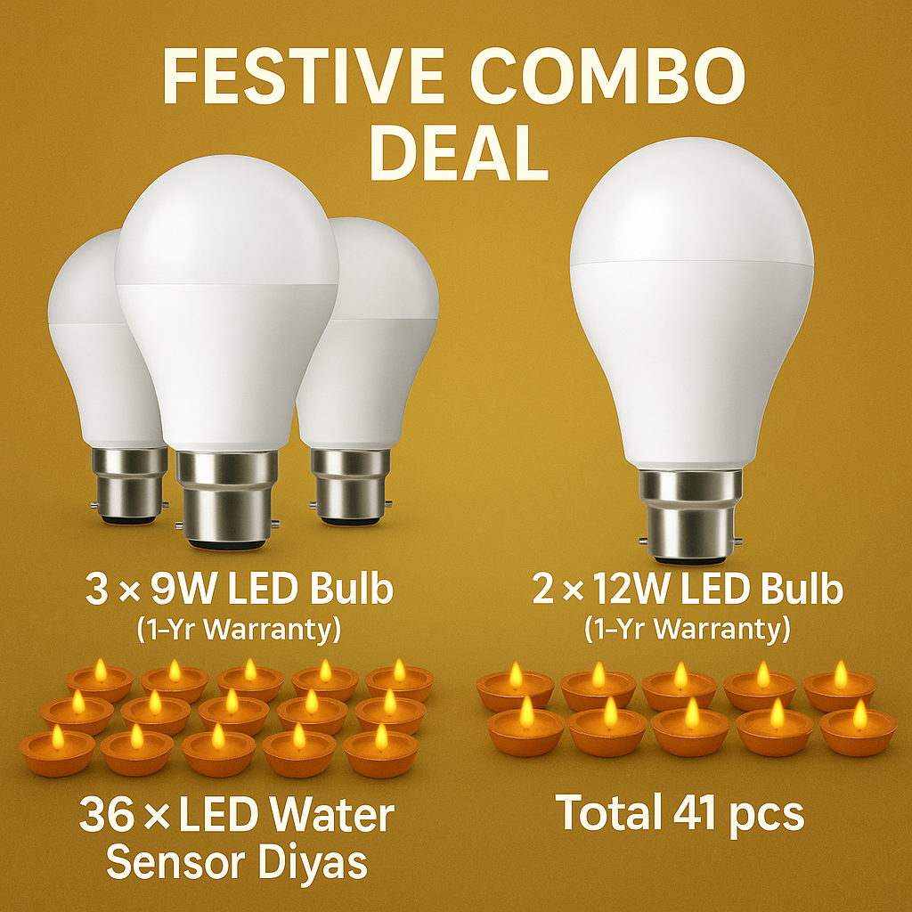 Festive Combo Deal – 3× 9W LED Bulb (1-Yr) + 2× 12W LED Bulb (1-Yr) + 36× Water-Sensor Diyas (Total 41 pcs)