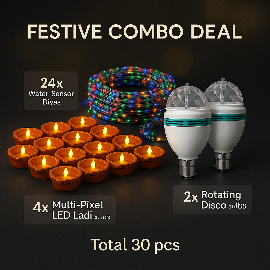 Festive Combo Deal – 24× LED Smokeless Water-Sensor Diyas + 4× Multi-Pixel LED Ladi (20 m each) + 2× Rotating Disco Bulbs